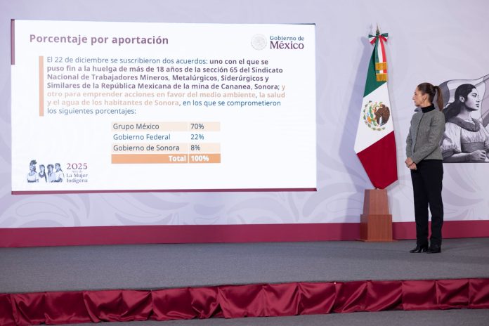 La Presidenta de México, Claudia Sheinbaum Pardo, anunció que en 2026 comenzará la construcción de las obras del Plan de Justicia para Cananea, Sonora, luego de concretarse un acuerdo histórico con los trabajadores mineros tras 18 años de huelga. Durante su participación en la conferencia matutina “Las mañaneras del pueblo”, afirmó que el Gobierno de México impulsará proyectos orientados a la salud, el agua y la remediación ambiental para atender los daños ocasionados por la contaminación en la región.